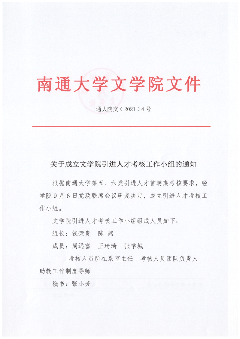 【通知】关于成立文学院引进人才考核工作小组的通知