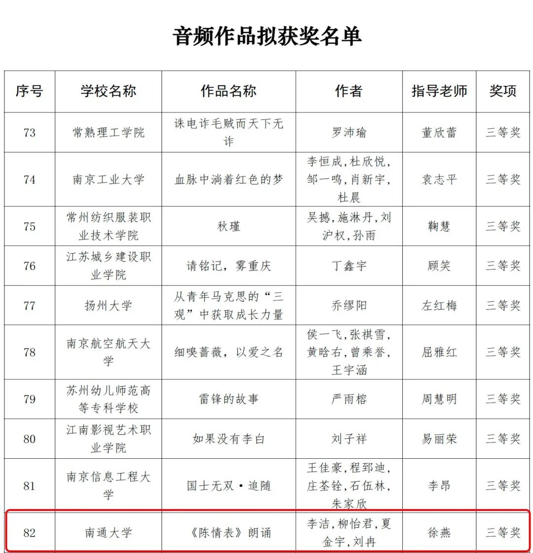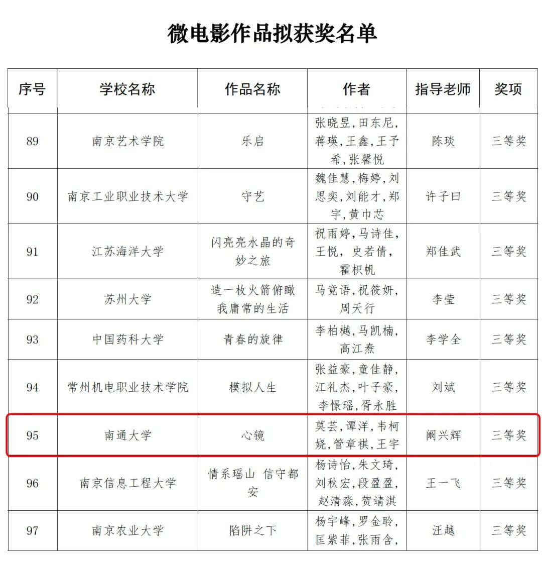 近日,江苏省委教育工委、江苏省教育厅公布了2023年江苏省大学生网络文化节和高校网络教育优秀作品推选展示活动遴选结果。经过高校申报、材料初审、专家评审,我院共三项作品在江苏省大学生网络文化节中取得佳绩,微视频作品《中国人物—雷锋》荣获微视频类三等奖,微电影作品《心镜》荣获微电影类三等奖,音频作品《陈情表》荣获音频作品类三等奖。