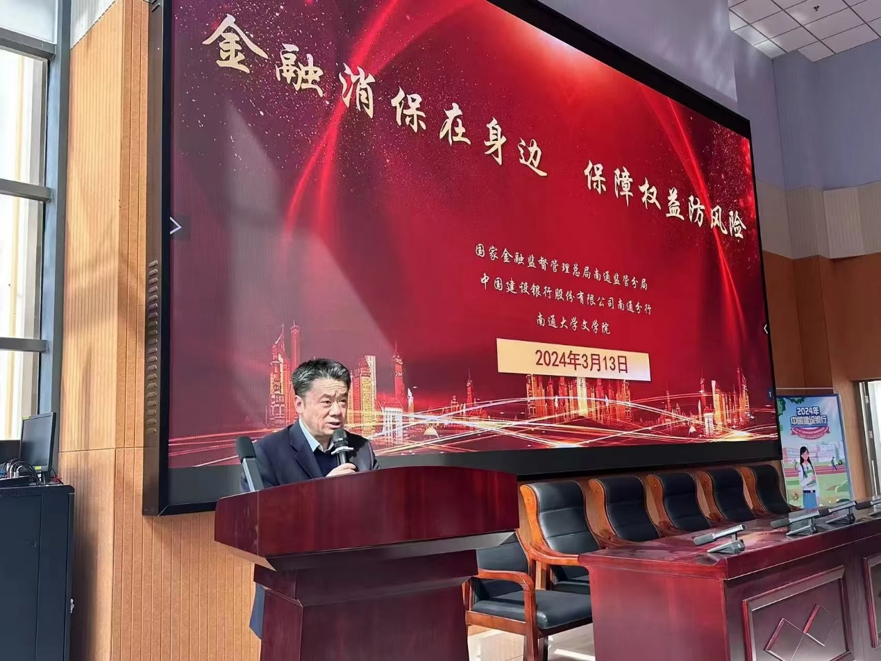 313日,为提升在校大学生的金融素养和风险意识,确保他们能够有效地维护自身权益,文学院携手国家金融监督管理总局南通监管分局以及中国建设银行股份有限公司南通分行,共同开展了一场主题为“金融消保在身边,保障权益防风险”的宣传教育活动。