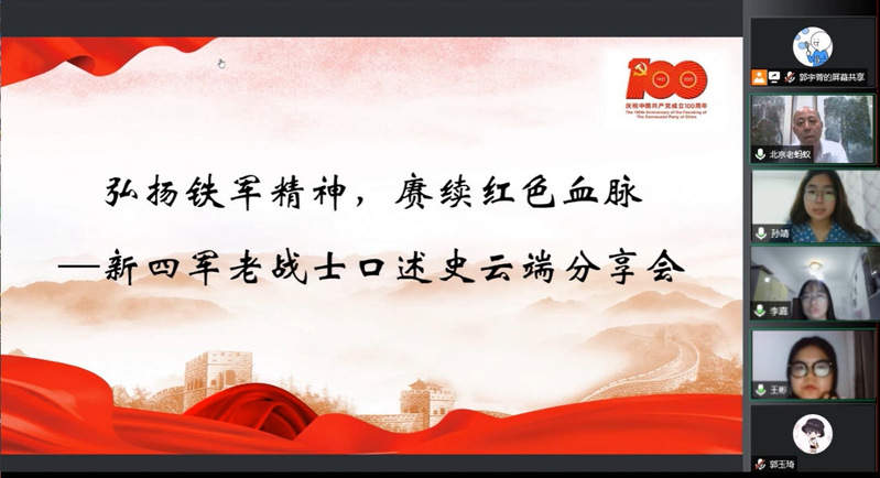 8月22日晚,南通大学“发扬红色传统,传承红色基因——南通地区红色资源调研团”齐聚“云端”,并邀请中华口述历史研究会常务理事、南京民间抗日战争博物馆副馆长薛刚,盐城新四军纪念馆馆员王金鑫,共同举办“弘扬铁军精神,赓续红色血脉——新四军老战士口述史云端分享会”。本次活动是调研团师生在前期寻访、收集、整理新四军老战士口述史基础上,共同交流、分享心得与收获。