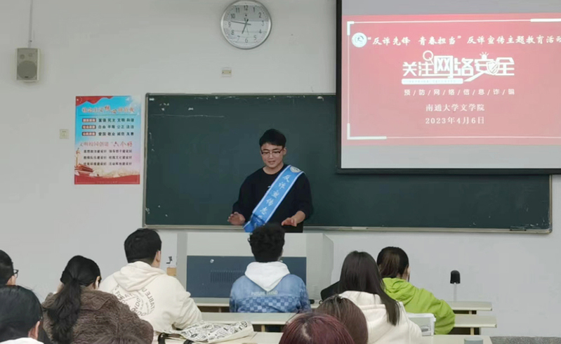 活动由学院选出的防诈宣传员负责宣讲,采用幻灯片、视频案例和你问我答等多种形式,从校园师生群体高发诈骗类型、电信网络诈骗犯罪新趋势和如何从底层逻辑防范网络电信诈骗等方面进行了讲解,并结合近年来发生在校园内的真实诈骗案例,揭露网络诈骗的特点、类型、手段及危害。宣讲结束后,同学们在班委的带领下郑重签署了《南通大学文学院防范网络电信诈骗承诺书》。